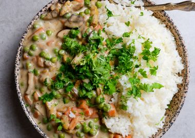 Oignons, poivrons, tomates épluchées, Lait de coco beurre de cacahouète, quand tout est cuit, rajout des émincés de soja a cuire pendant 25 min: une merveille !