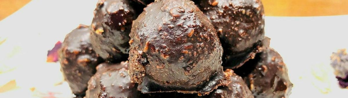 Roulez ensuite les boules dans un mélange de fèves de cacao et de noisettes concassées.