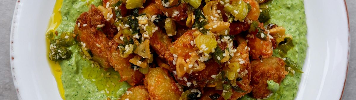 Pour la crème verte, couper les oignons verts en deux et les faire revenir brièvement dans un peu d'huile dans une poêle. Passez-les ensuite au mixeur avec le reste des ingrédients (petit bouquet d'aneth, 1 petit bouquet de persil, 3 cuillères à soupe de tahini, 5 cuillères à soupe de yaourt alternatif, le jus de 0,5 citron, sel et poivre).
