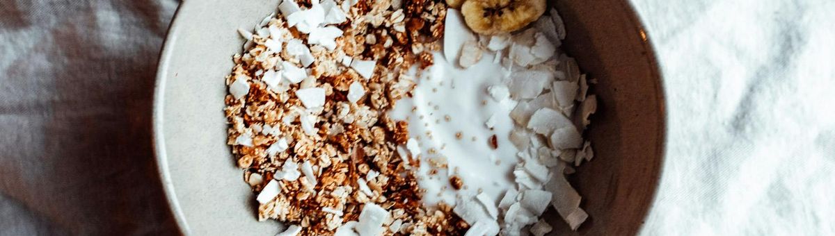 Laisse refroidir complètement le granola avant de l'émietter avec les mains. Serve ton granola avec du yaourt à la noix de coco et décore-le avec de la noix de coco râpée et les chips de banane.