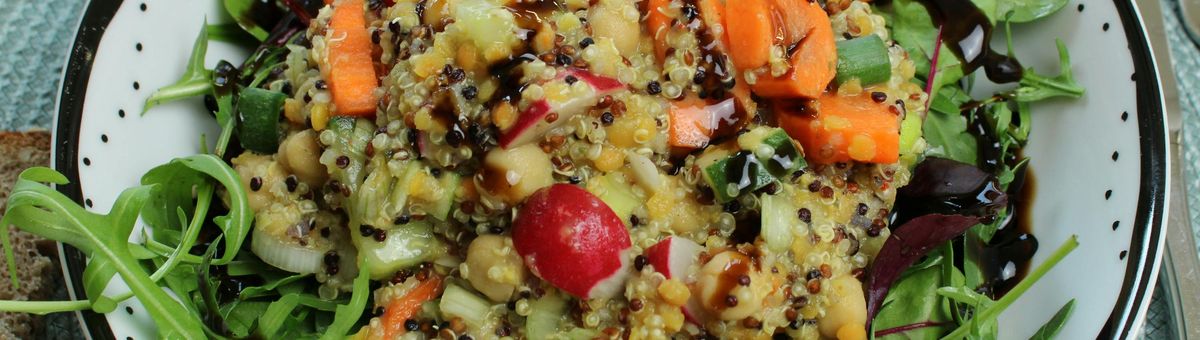Parfait pour les petits creux : Salade de lentilles et quinoa avec des carottes, du concombre, des oignons de printemps et des radis.